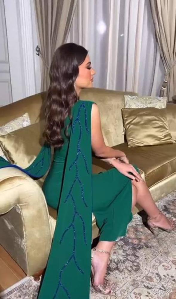 الجزء الأبرز في التصميم هو الكاب الطويل المتصل من الكتفين والمنسدل إلى الأرض، والمزخرف بتطريزات لامعة على شكل فروع أو نقوش نباتية باستخدام الخرز الداكن، ما يضفي لمسة ملكية راقية على الإطلالة.