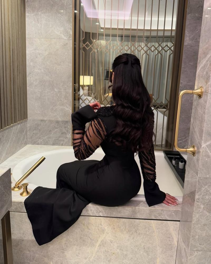 الأكمام الطويلة الشفافة مصنوعة من التول المزموم، مع تطريز متداخل يمنحها مظهراً جذاباً، وتنتهي بقصة واسعة عند المعصم تضيف طابعاً درامياً ناعماً. الفستان مصنوع من قماش انسيابي بلمسة ساتانية خفيفة، ويمنح إطلالة أنثوية ساحرة مناسبة للسهرات والمناسبات الراقية