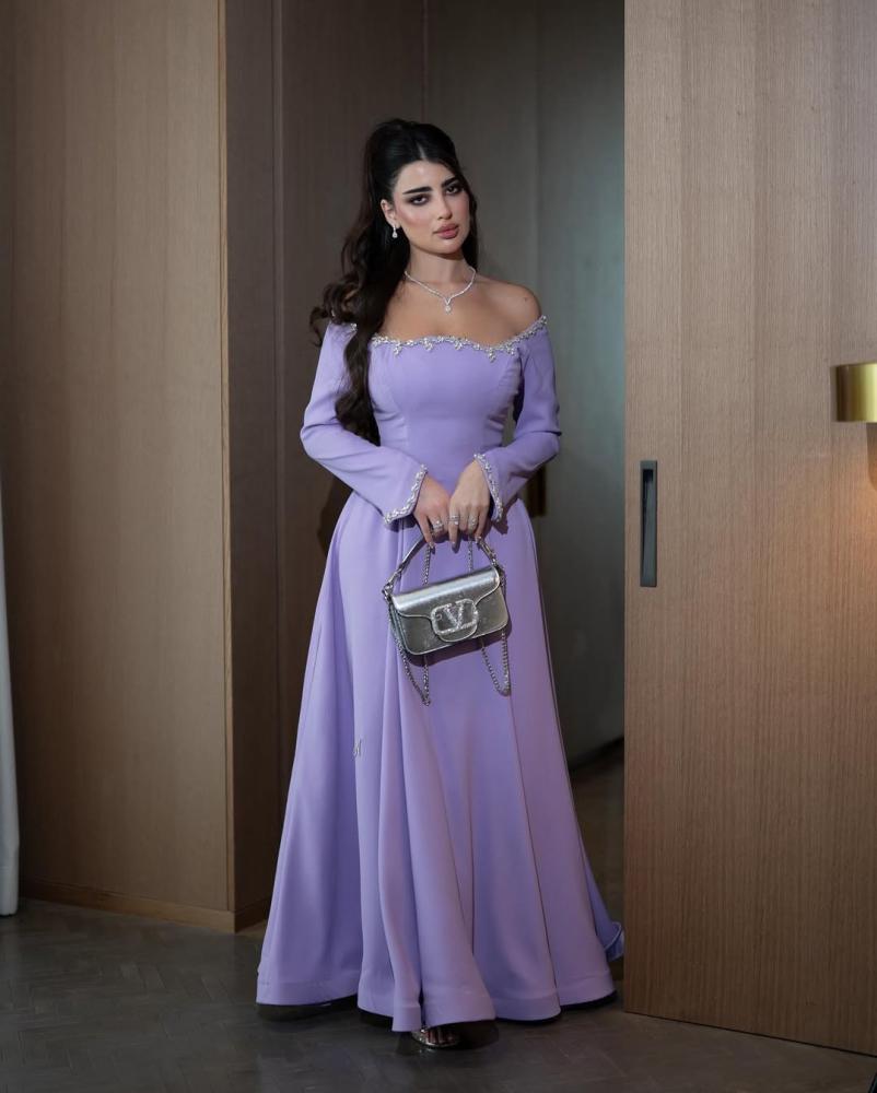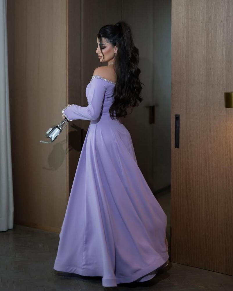 فستان أنيق بلون لافندر ناعم (بنفسجي فاتح)، يتميز بتصميم أوف شولدر مع أكمام طويلة وواسعة قليلاً عند الأطراف، ليمنح إطلالة أنثوية راقية ومفعمة بالنعومة.