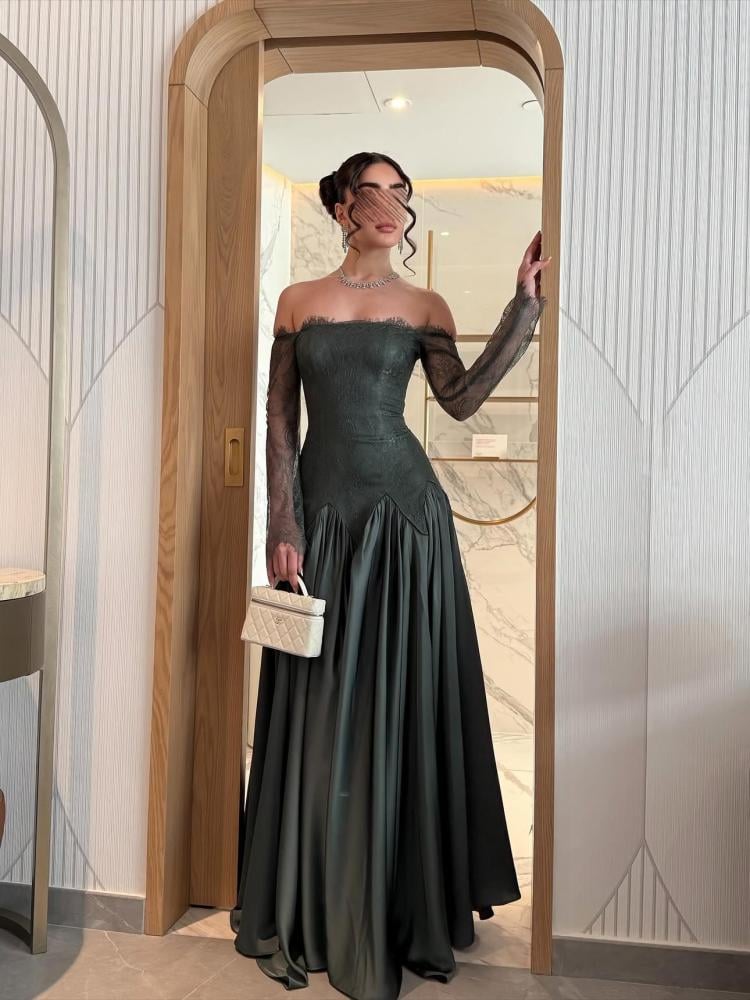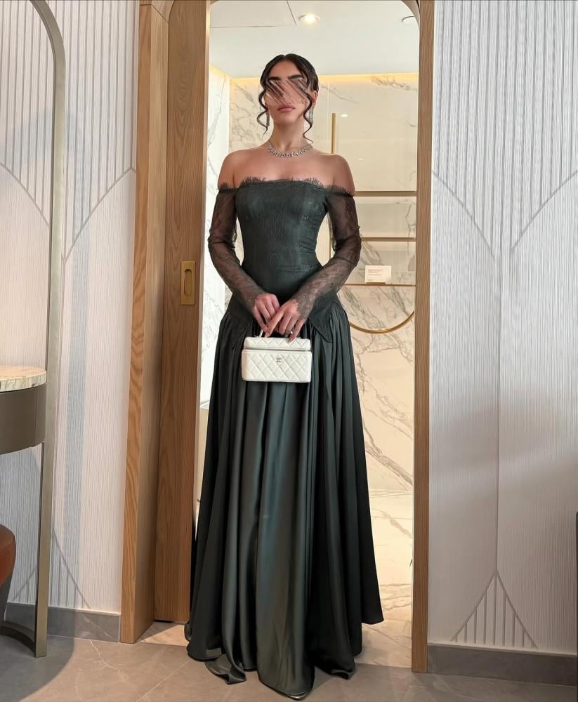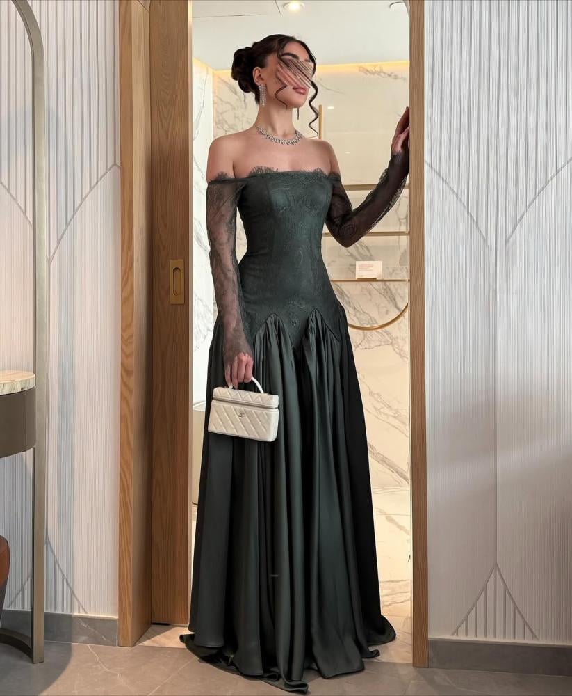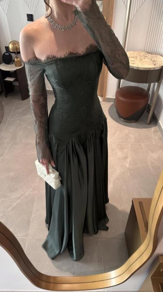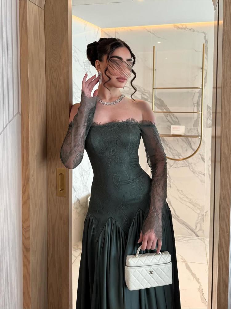 • الفستان مصنوع من قماش الدانتيل الأسود أو الأخضر الغامق جدًا في الجزء العلوي، ما يمنحه لمسة راقية وكلاسيكية.