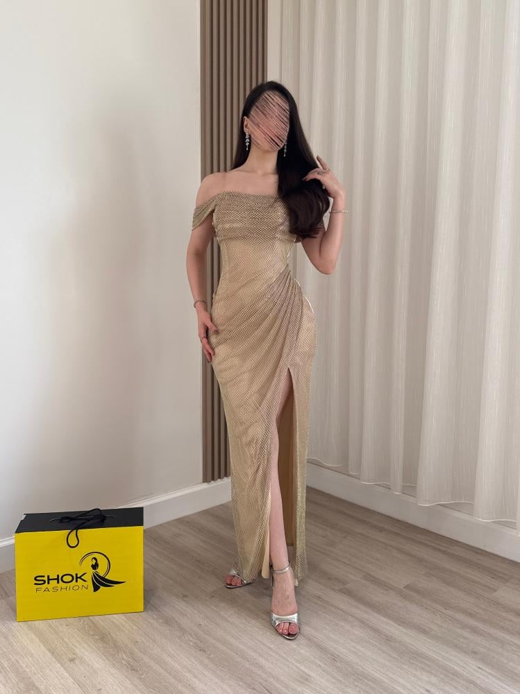 الفستان يتميّز بتصميم راقٍ وفخم بلون ذهبي شامباني لامع يعكس الأناقة والرقي. مصنوع من قماش شبكي مطرّز بخيوط براقة دقيقة تمنحه بريقًا أنثويًا جذابًا، مع قصة ضيّقة على الجسم تُبرز القوام بانسيابية فاخرة.
