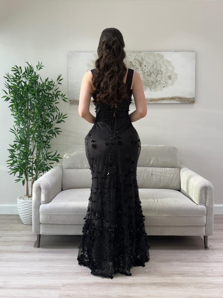 - القماش: قماش حريري مطفيّ فخم مطعّم بتطريزات ناعمة وتفاصيل بارزة من الخرز والورود الثلاثية الأبع