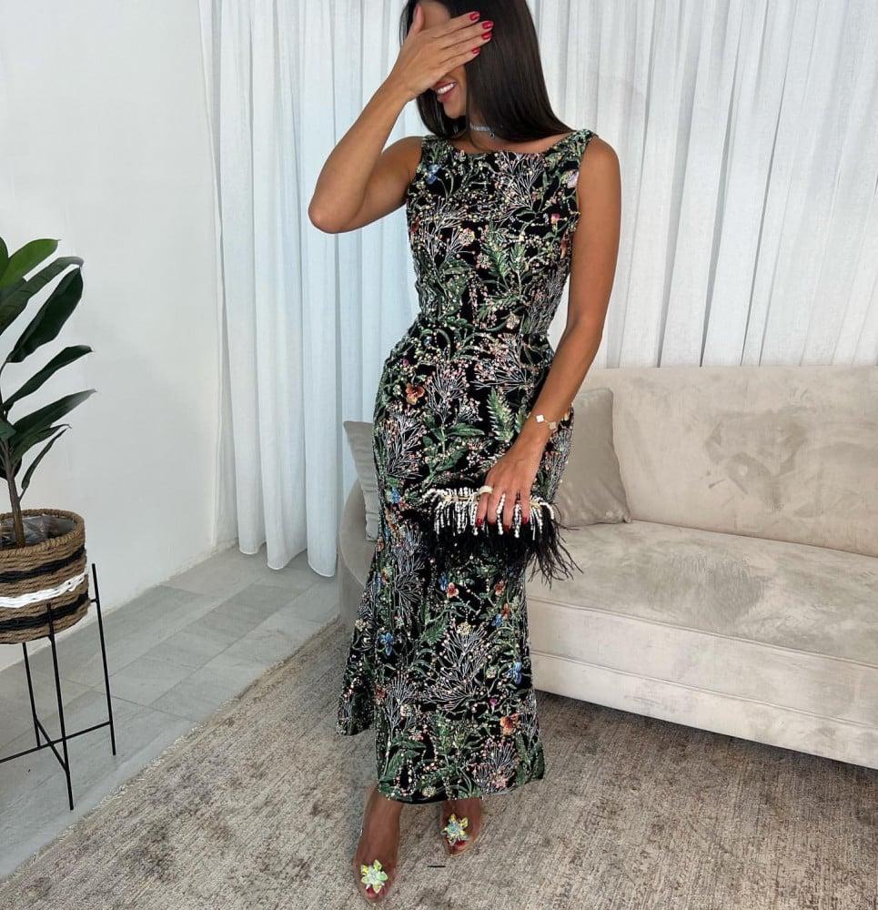 صُمّم الفستان بطول يصل إلى الأرض وقصة ضيقة تبرز منحنيات الجسم بأسلوب مدهش، تتناسق بشكل مثالي مع العنق الدائري الرقيق. ومع هذا الفستان، يحتل الفن التعبيري تفاصيله العلوية بدقة ويُكمل الإطلالة حقيبة الكلاتش المزيّنة بالريش والتزيينات لتخلق توازنًا ساحرًا مع حذائك المفتوح بأزهاره المزخرفة.