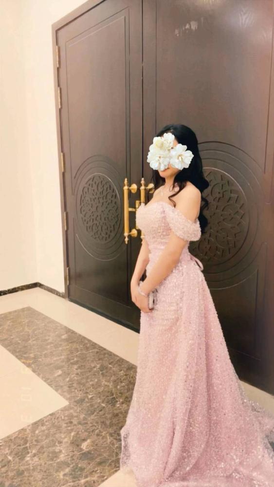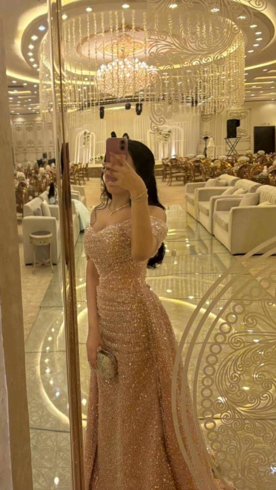 فستان طويل بتصميم أنيق بلون وردي لامع مائل للذهبي، مصنوع بالكامل من قماش مرصع بالترتر البراق الذي يمنح إطلالة فاخرة لافتة للأنظار. يتميز بقصّة أوف شولدر تكشف الكتفين، مع حزام خفي يحدد الخصر ويبرز القوام بشكل أنثوي جذاب. تنورته منسدلة بانسيابية مع ذيل خلفي قصير يضيف لمسة ملكية، مما يجعله خياراً مثالياً للحفلات والمناسبات المسائية الفاخرة