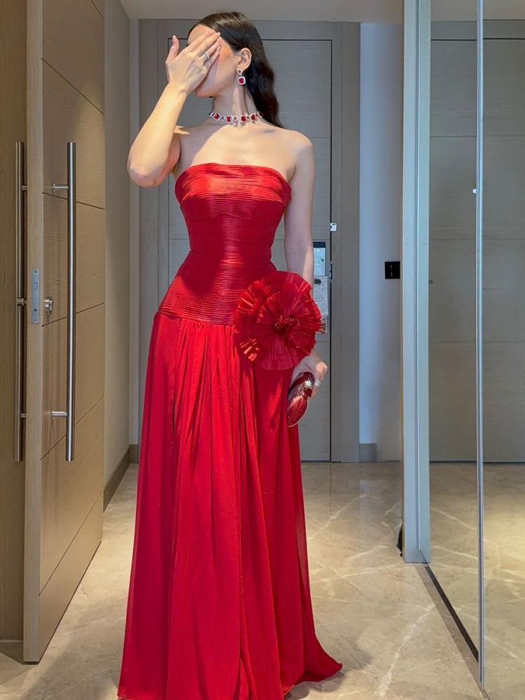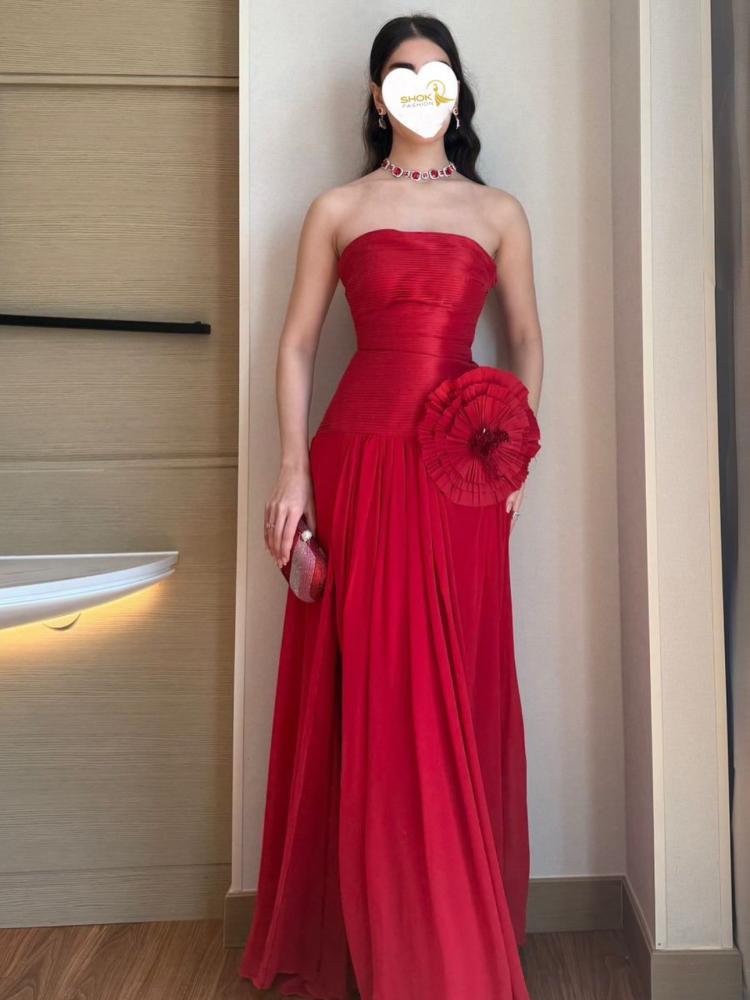فستان سهرة ساحر بلون أحمر جريء، يعكس الأنوثة والفخامة بإطلالة لافتة. يتميز بتصميم سترابلس (بدون حمالات) مع كورسيه علوي مشدود يبرز جمال الخصر ويمنح القوام مظهرًا ممشوقًا ومتناسقًا.