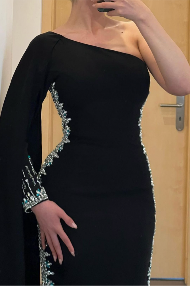 استعدي لتجربة لحظات السحر والجمال مع فستان كريب سترتش الأنيق، المصمم بأسلوب الساري الهندي. يتميز هذا الفستان بتصميم فريد يظهر بضعة عناصر تمنحك مظهراً ملهماً، مثل الكتف الواحد والتطريز الفضي المبهر الذي ينساب على جانب الفستان.