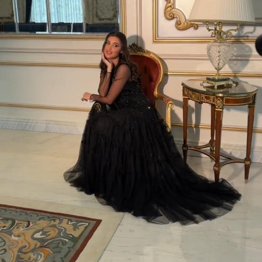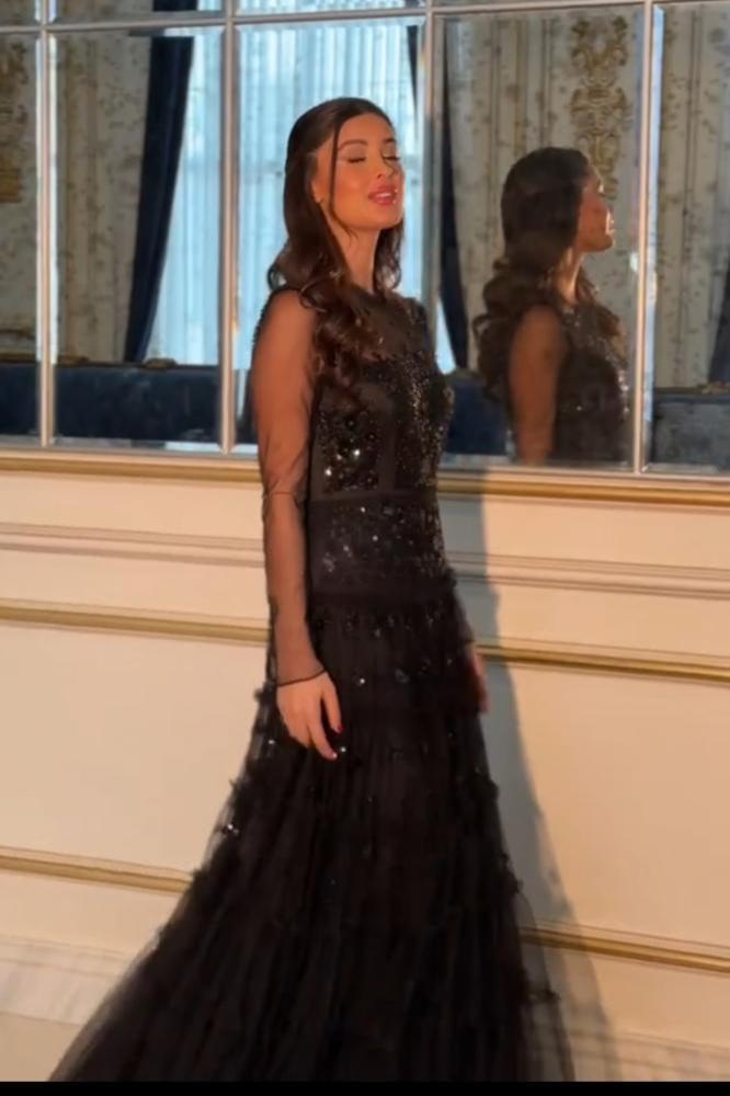 فستان سهرة أنيق باللون الأسود. يتميز الفستان بتصميم فاخر وطويل، مع أكمام طويلة شفافة مرصعة بتطريزات لامعة، ما يضفي عليه لمسة من الرقي والفخامة. القماش يبدو من التول أو الشيفون، مع تفاصيل لامعة في الجزء العلوي والسفلي تضيف بريقاً ناعماً للفستان