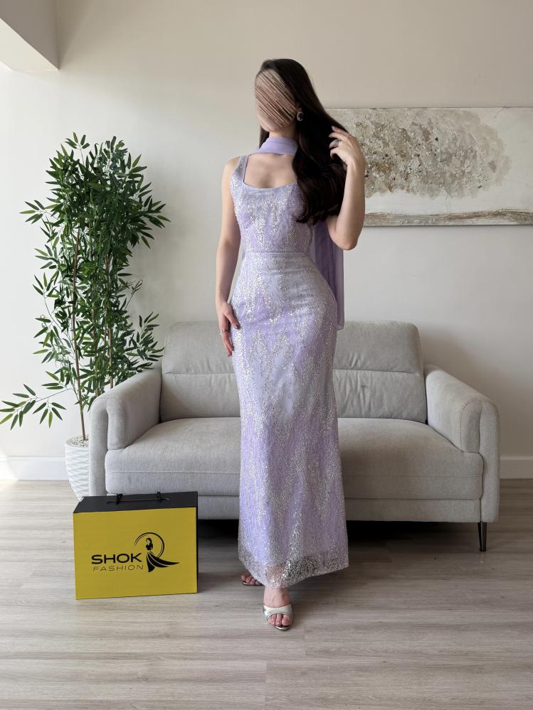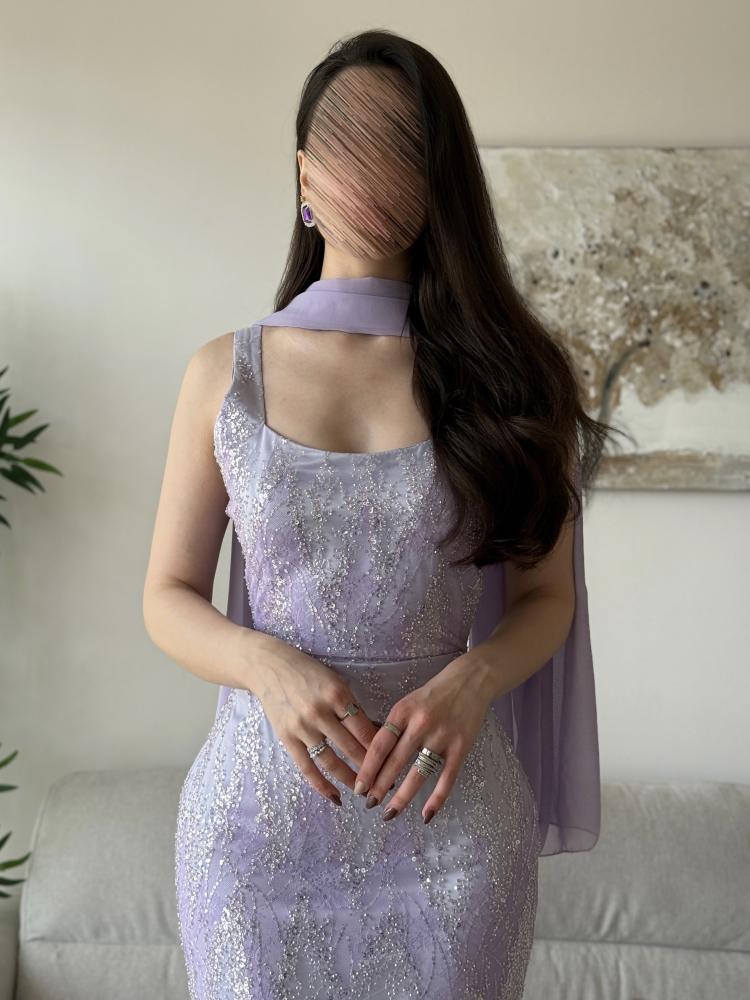 الفستان يتميّز بتصميم فخم وأنيق بلون شوكولاتة داكن جذاب، مصنوع من قماش شفاف راقٍ مطرّز بالكامل بالخرز والترتر المتناثر بطريقة هندسية تضيف لمسة من الفخامة والرقي. يتميز بقصّة ضيّقة تبرز جمال القوام مع أكتاف مكشوفة وأكمام طويلة شفافة تنسدل بشكل كاب أنيق يمنح الإطلالة حضوراً ملكياً.
