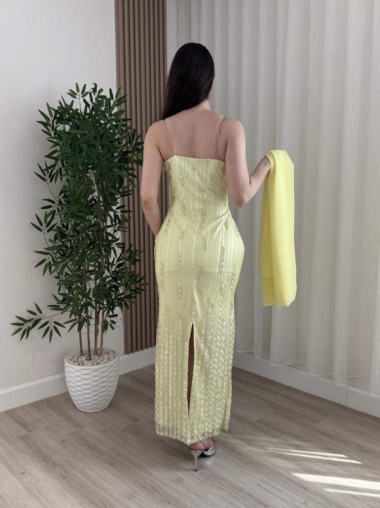 الفستان أنيق ومشرق بتصميم أنثوي ناعم بلون أصفر باستيلي فاتح يفيض بالحيوية والجاذبية. مصنوع من قماش دانتيل فاخر مطرّز بالكامل بتفاصيل دقيقة تضيف له لمسة فخامة ورقي. يتميّز الفستان بقصة الكتف الواحد التي تبرز جمال العنق والأكتاف، مع وشاح طويل من القماش نفسه ينسدل بانسيابية ليعزز الإطلالة بلمسة راقية.
