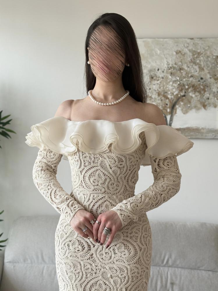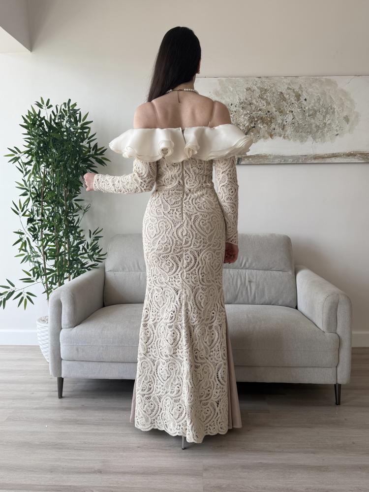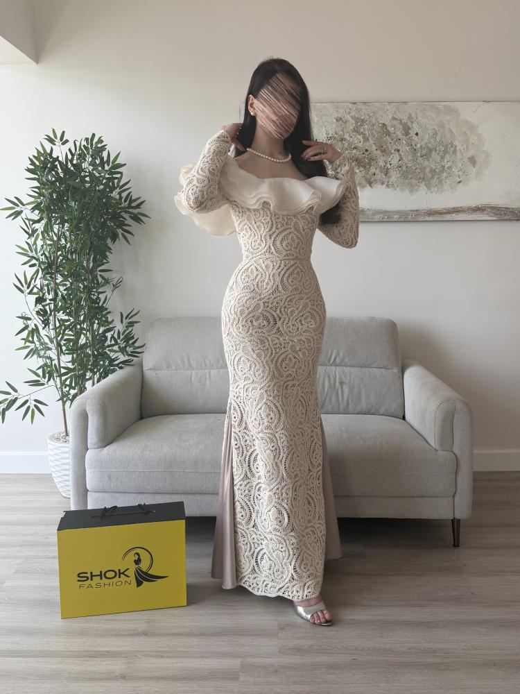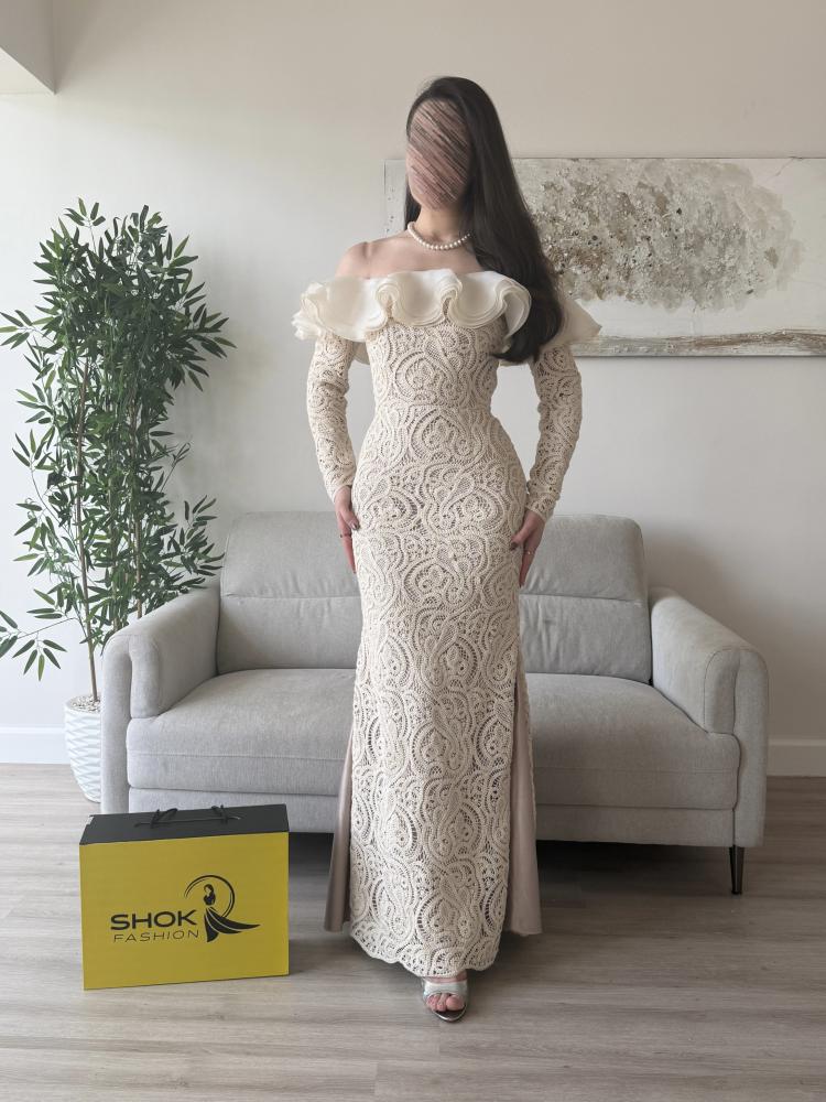 الفستان أنيق وفخم بتصميم أنثوي راقٍ بلون بيج عاجي ناعم يمنح إطلالة راقية ومشرقة. مصنوع من قماش دانتيل فاخر بتطريزات بارزة متداخلة، تضيف عمقًا وتميّزًا للتصميم. يتميّز الفستان بقصة الأكتاف المكشوفة التي تبرز الرقبة والأكتاف بأنوثة ناعمة، وتعلوها طبقة كشكش من الساتان الفاخر تضفي لمسة درامية أنيقة.