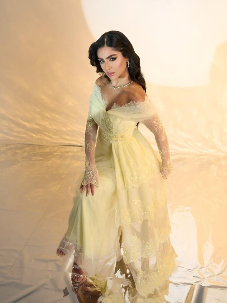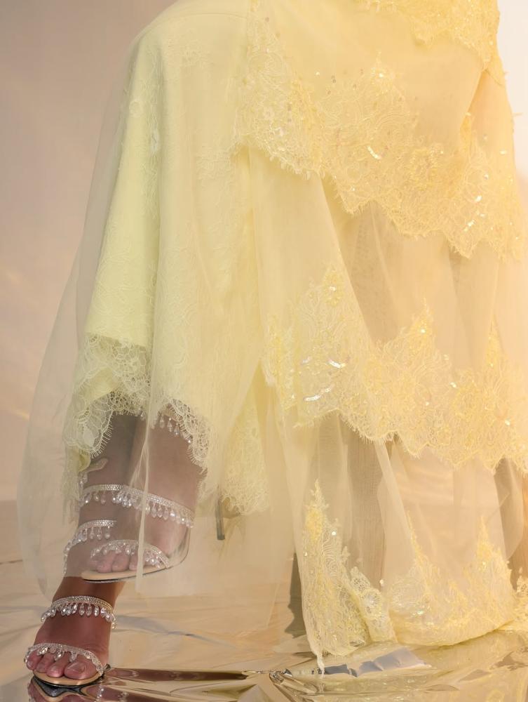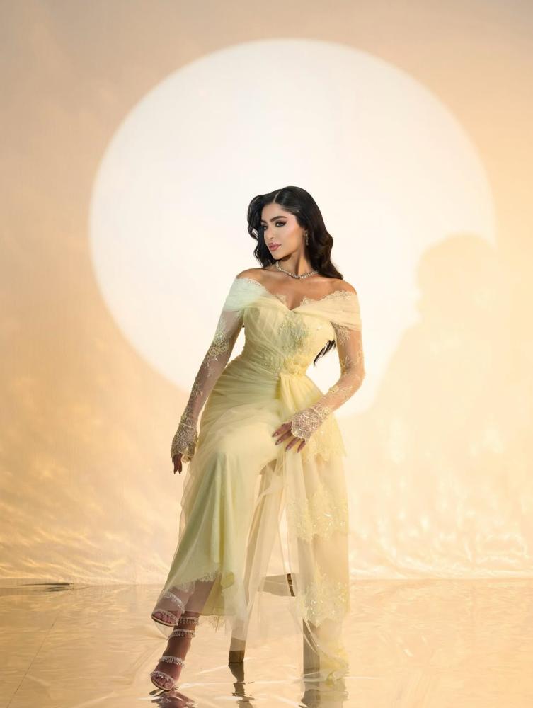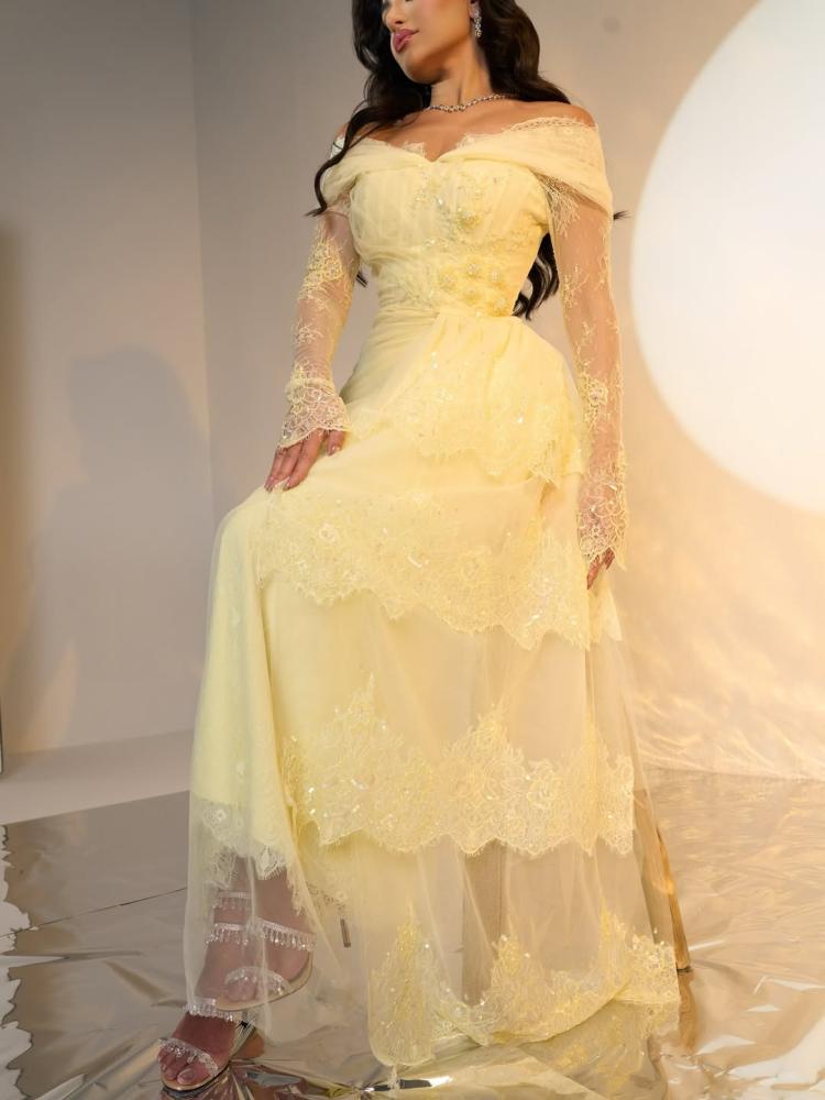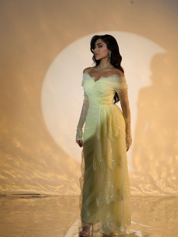 فستان سهرة أنثوي راقٍ بلون أصفر باستيلي ناعم، مستوحى من الطابع الرومانسي الكلاسيكي. يتميز بتصميم أوف شولدر يبرز الأكتاف، مع طبقات من التول الشفاف التي تنسدل بلطف على الذراعين وتمنح لمسة حالمة وأنيقة.