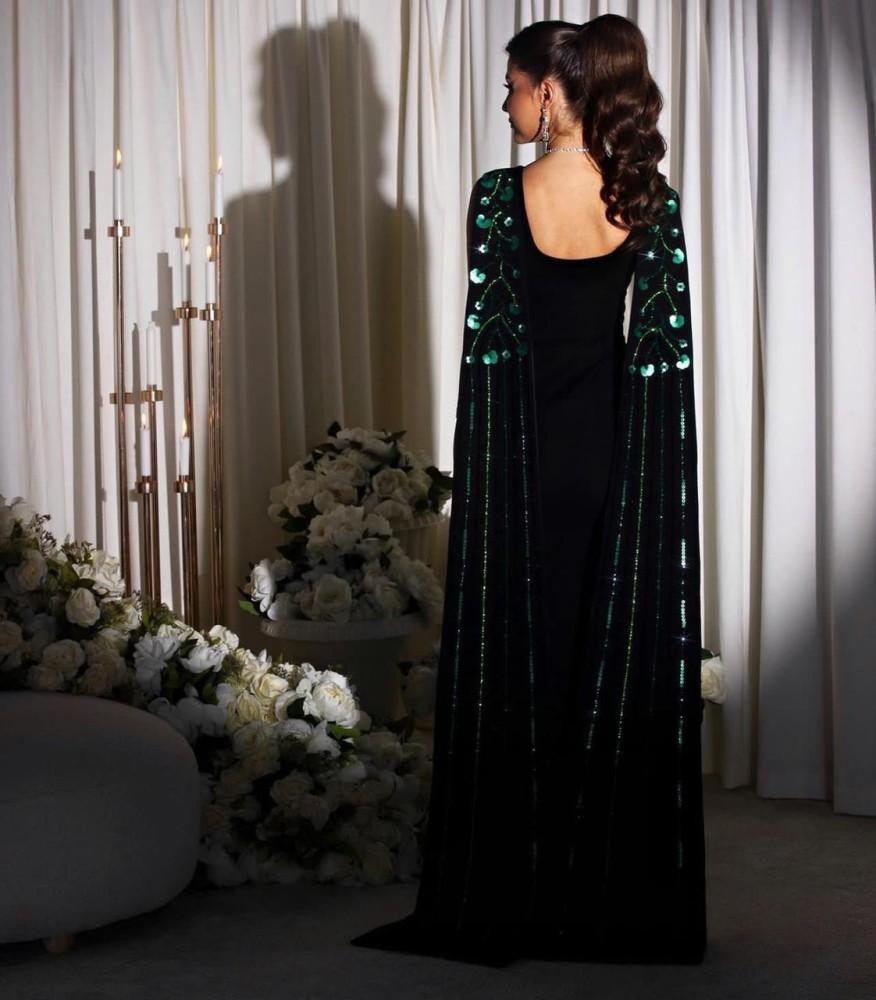 فستان سهرة أسود فاخر بتصميم أنيق وطابع ملكي، يتميز بقصة ضيقة وطول ماكسي يبرز أنوثة القوام ببساطة راقية. ما يميز هذا الفستان هو الكاب الطويل المتصل بالأكتاف، والمصمم من قماش مخملي أخضر مزين بتطريزات لامعة بلمسات زمردية تخطف الأنظار.