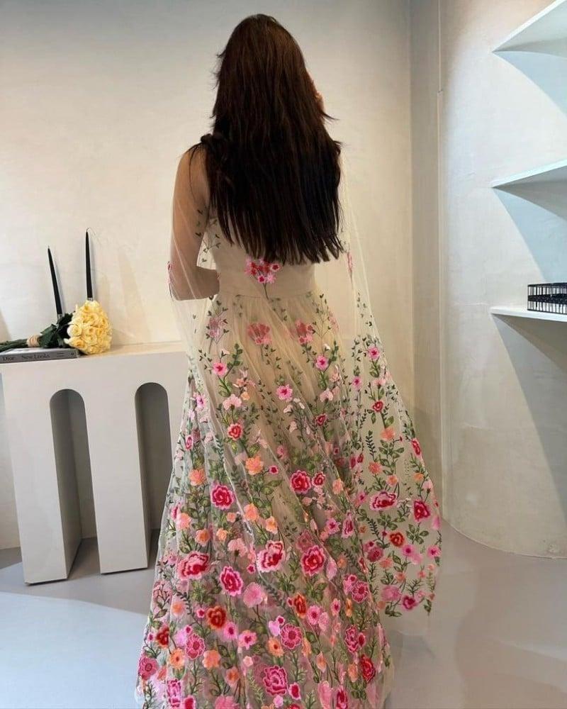 التنورة طويلة ومنسدلة بانسيابية مع تطريزات الأزهار المتدرجة من المنتصف حتى الحاشية، لتعطي تأثيراً بصرياً جذاباً يشبه حديقة زهور.